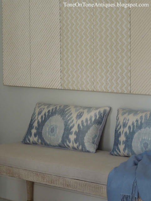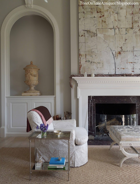 On the other side of the living room opposite the fireplace is this chic sitting group. Flanking the sofa is a pair of Zuber grisaille screens. The painted armchairs are from Tone on Tone.