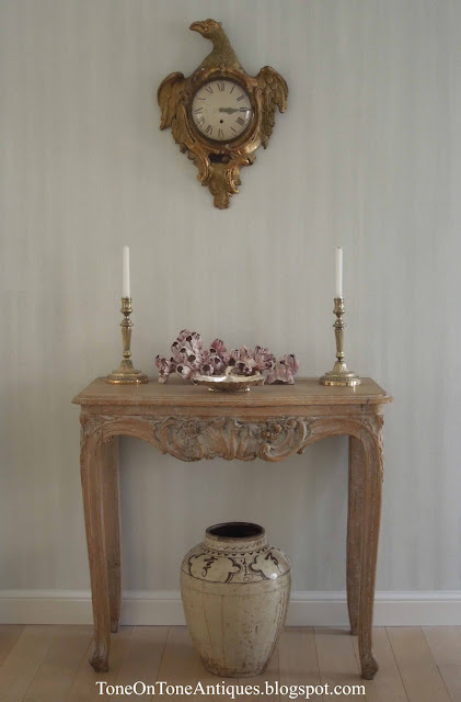 Frank found this French bleached wood console table at our shop. The pot is Chinese and the cartel clock is most likely Swedish.